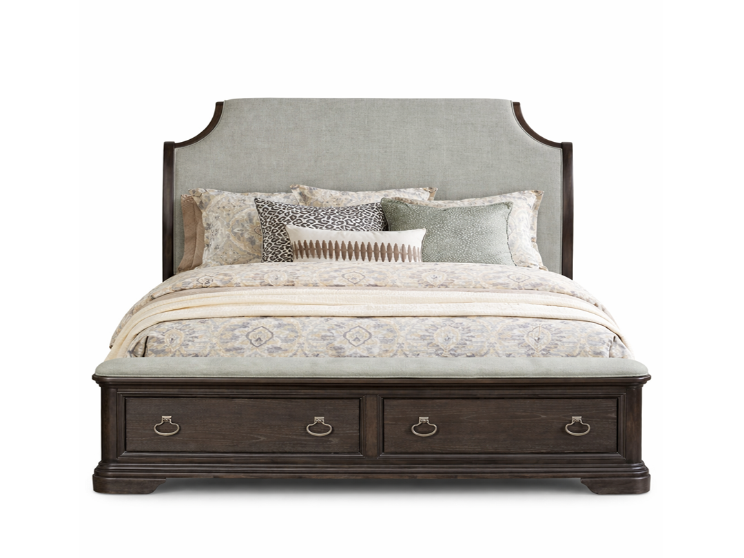 Acacia King Upholstered Bed with Storage, Complete Dark Wood Bedroom Set