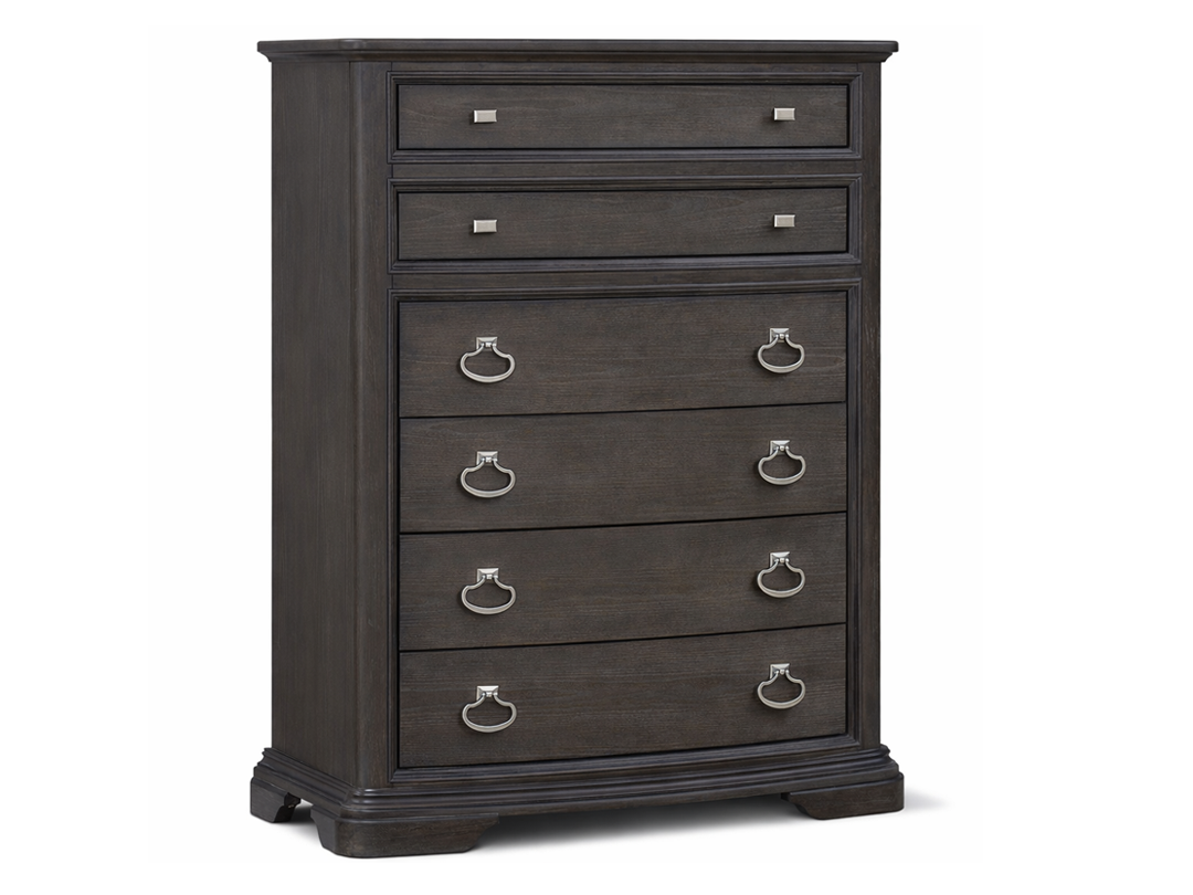 The collection includes a King bed, nightstand, mirror, six-drawer dresser and five-drawer chest, creating a coordinated suite suited to primary bedrooms, refined guest rooms, or transitional interiors that blend traditional craftsmanship with modern comfort. The dark wood pairs beautifully with neutral walls, soft taupes, layered creams, and brushed-metal accents, making it well-suited to both classic and updated interior schemes.