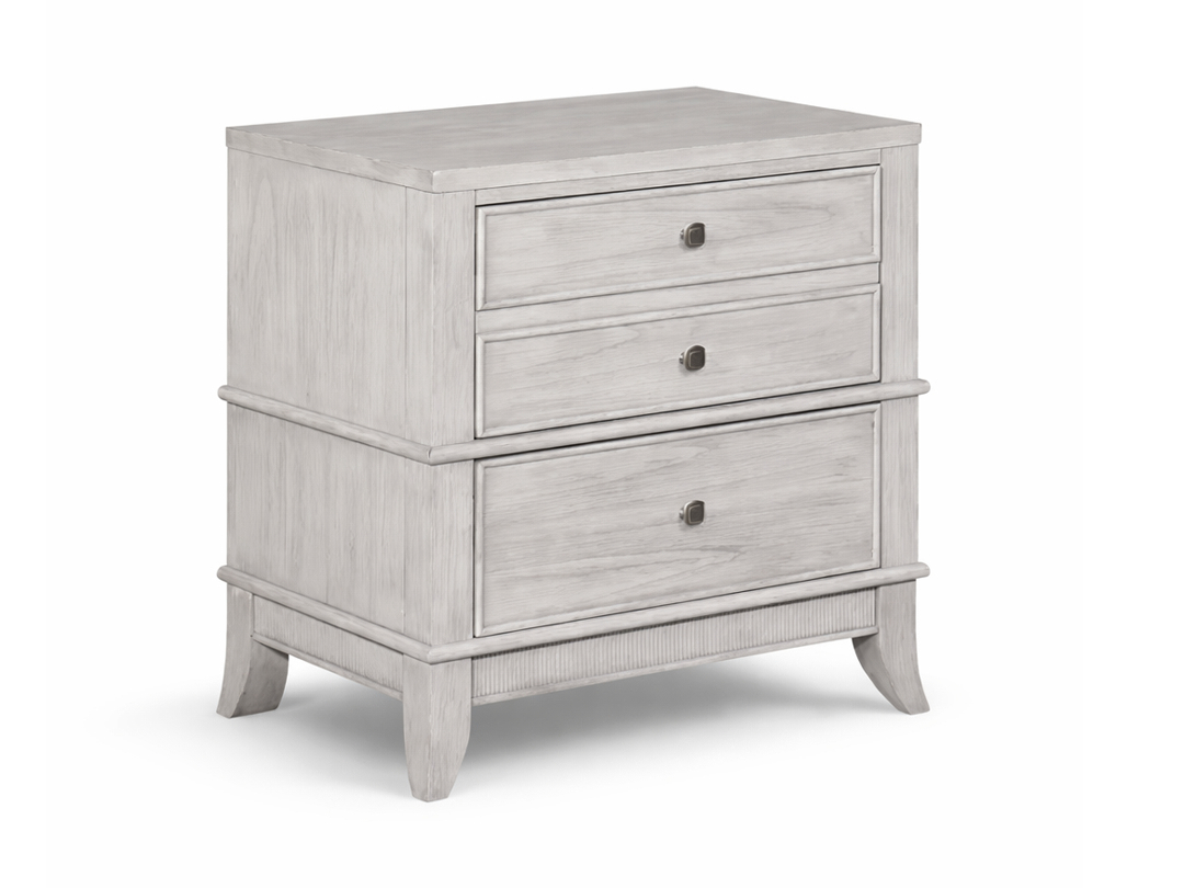 Crafted from poplar solids and mindi veneers, a beautifully coordinated bedroom collection finished in a soft, brushed white tone with subtle grey undertones brings calm sophistication to the sleeping space. The natural grain gently shows through the finish, creating depth while maintaining a light, airy character that brightens the room. A graceful sleigh-style headboard framed with refined nailhead trim introduces architectural presence, while the upholstered panel adds comfort and texture in soft neutral fabric.